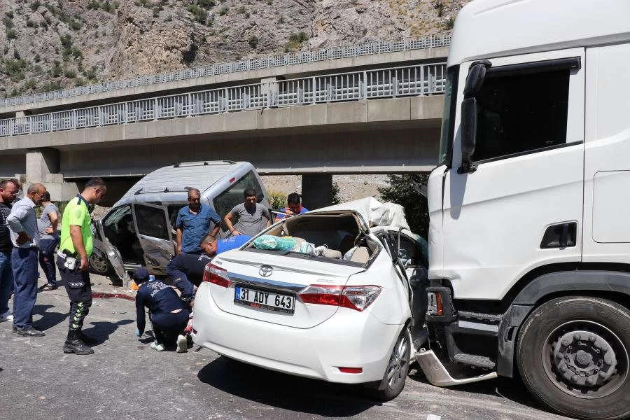 Kaza yapan otomobile hafif ticari aracın arkasında seyir halinde olan 01 ARV 58 plakalı tır çarptı.