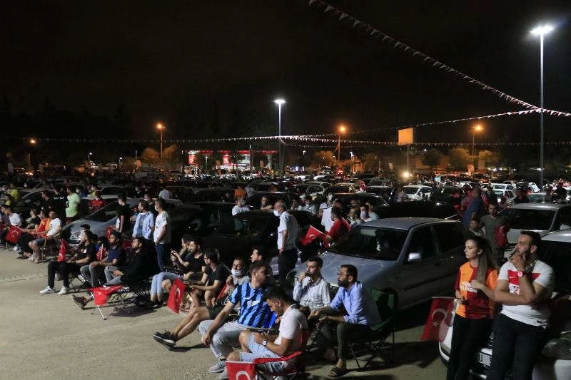 Euro 2020 Türkiye-İtalya maçını, Adanalı vatandaşlar millet bahçesi içerisinde kurulan dev ekran ile araçlarında izleme imkanı buldu.