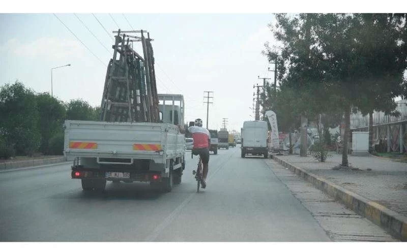 Adana’da bir bacağı olmayan engelli bir kişinin trafikte bisiklet sürerken kamyonete tutunup yolculuk yapması görenleri hayrete düşürdü.